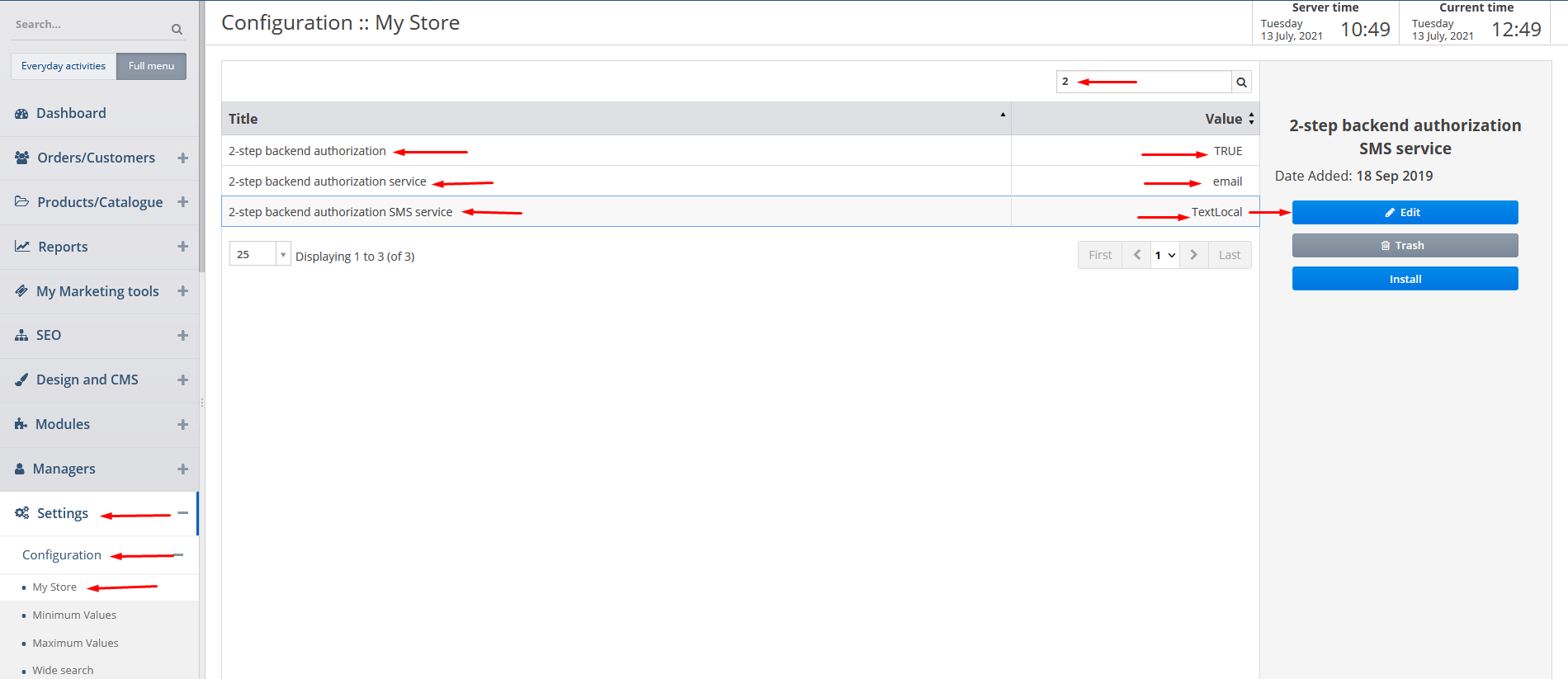 After you accessed the admin area of your website click on Settings, Configuration and My Store tabs. Find 2-step backend authorization functionality. On this page you can enable/disable 2-step backend authorization functionality by clicking on it, then on Edit button and then choosing either True or False. You can also specify 2-step backend authorization service by clicking on it, then on Edit button and then choosing either email or sms. If you choose sms for 2-step backend authorization service you can click on 2-step backend authorization SMS service, then on Edit button and then choose the required SMS service.