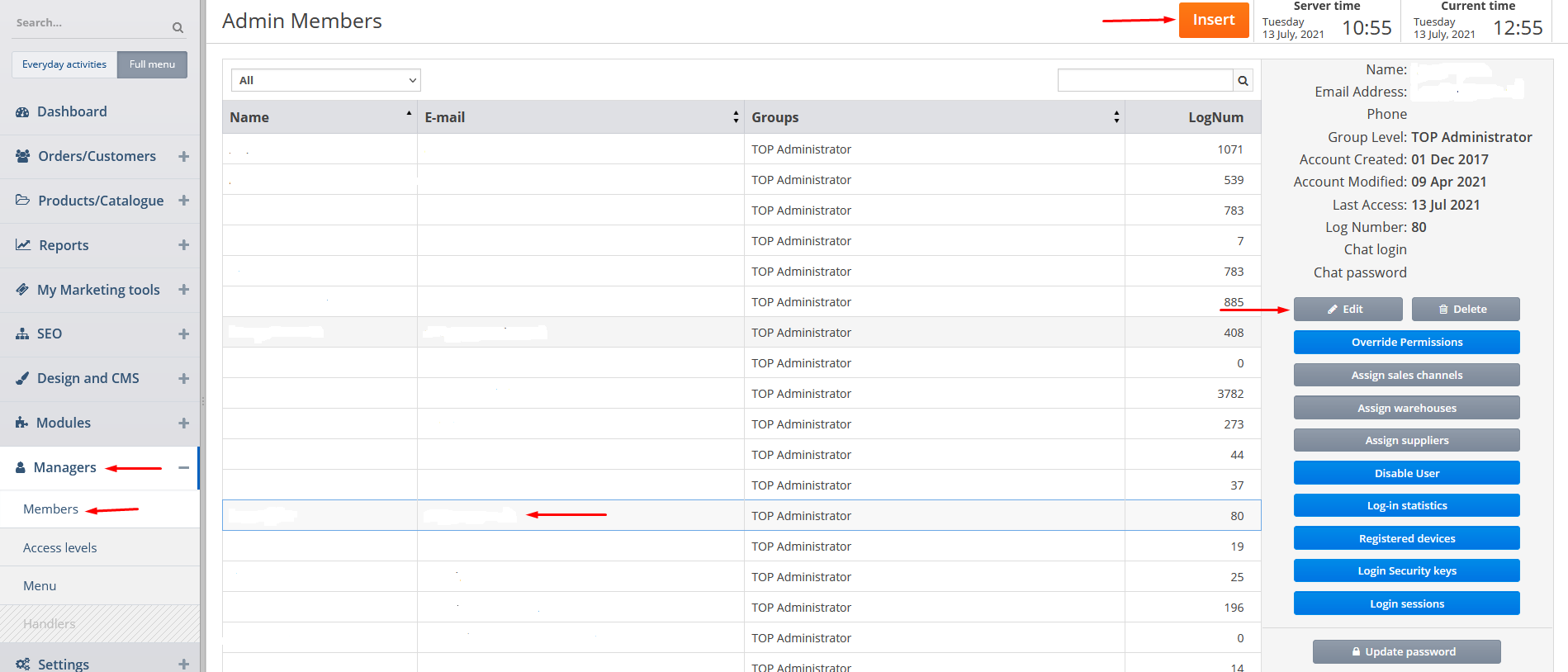 Click on Managers and Members tabs. Click on the required member and then on Edit button or click on Insert button to add a new member.