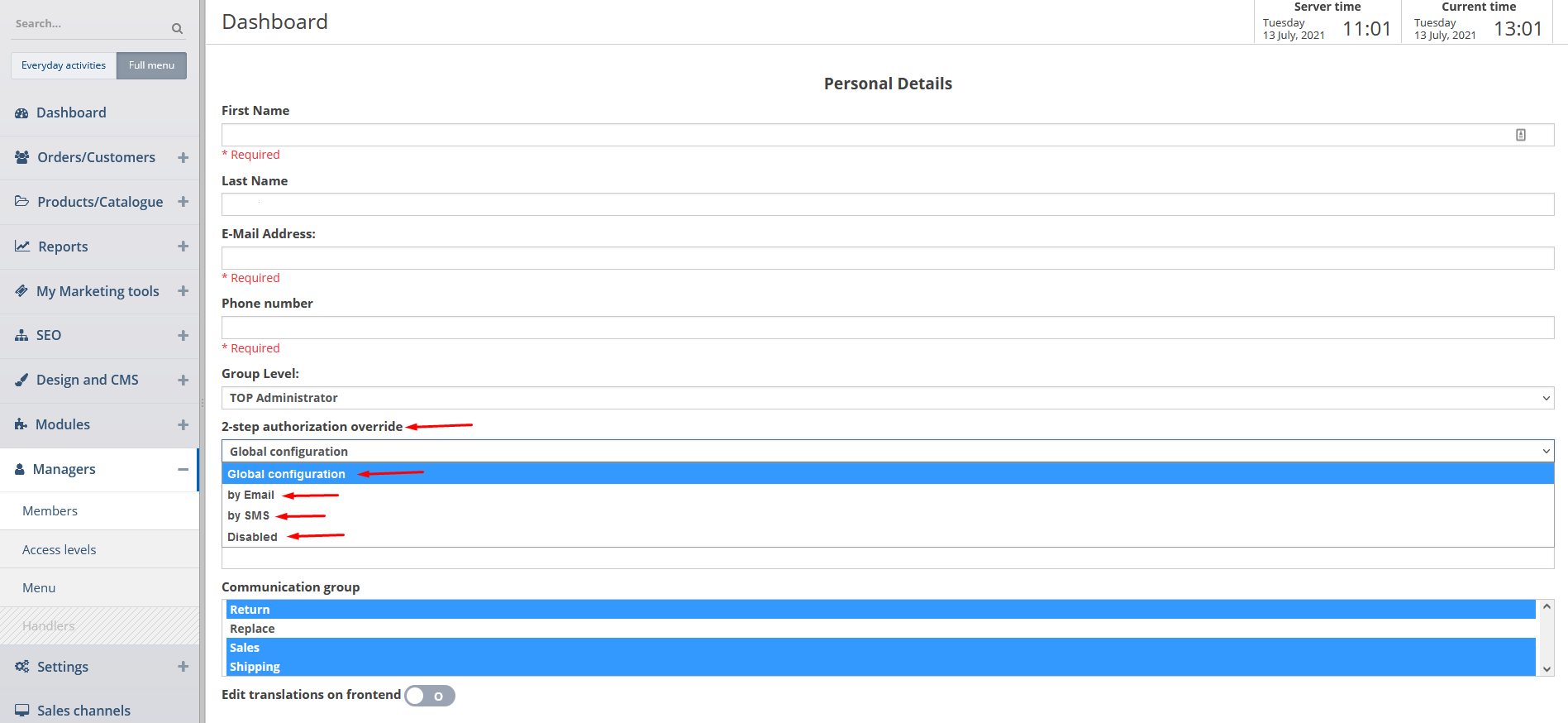 While adding/editing a member you can specify what 2-step authorization override you can choose for this member (if Global configuration is chosen the global settings (as described above) will be applied to this member, the other options are self-explanatory).