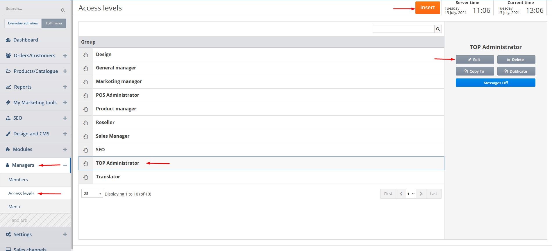 Click on Managers and Access levels tabs. Click on the required group and then on Edit button or click on Insert button to add a new group.