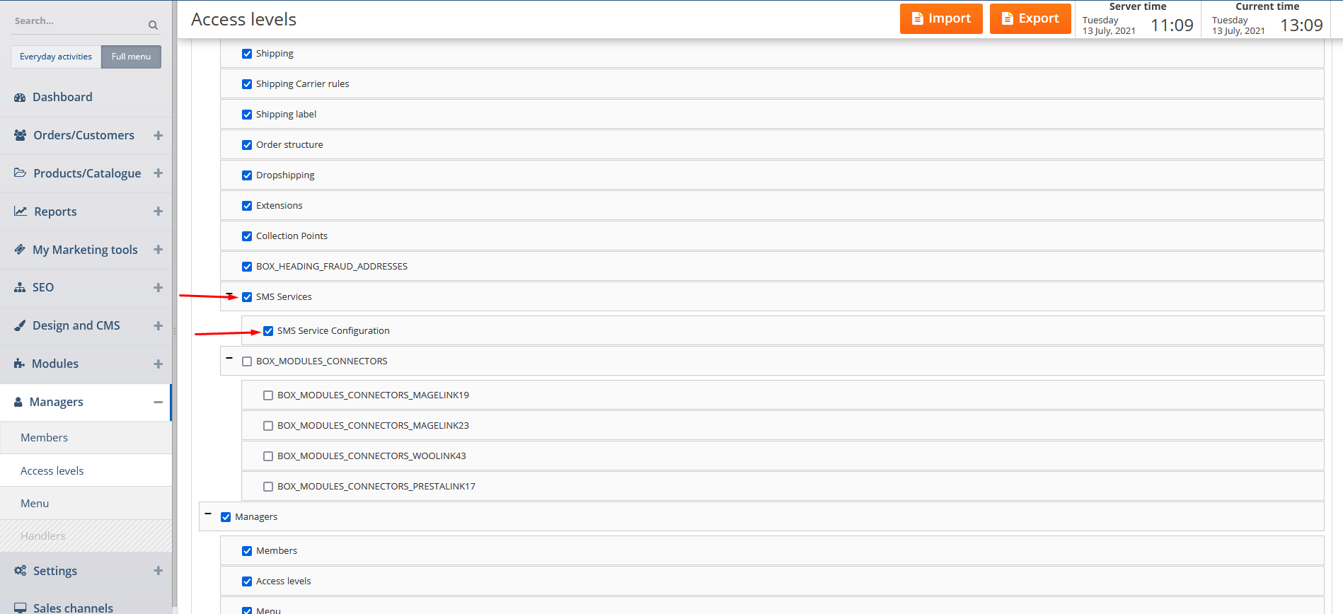If the boxes next to SMS Services and SMS Service Configuration options are checked the member for the corresponding group will be able to access and set up SMS services. Click on Modules, SMS Services and SMS Service Configuration tabs. Click on the required service, install, enable and set it up accordingly.