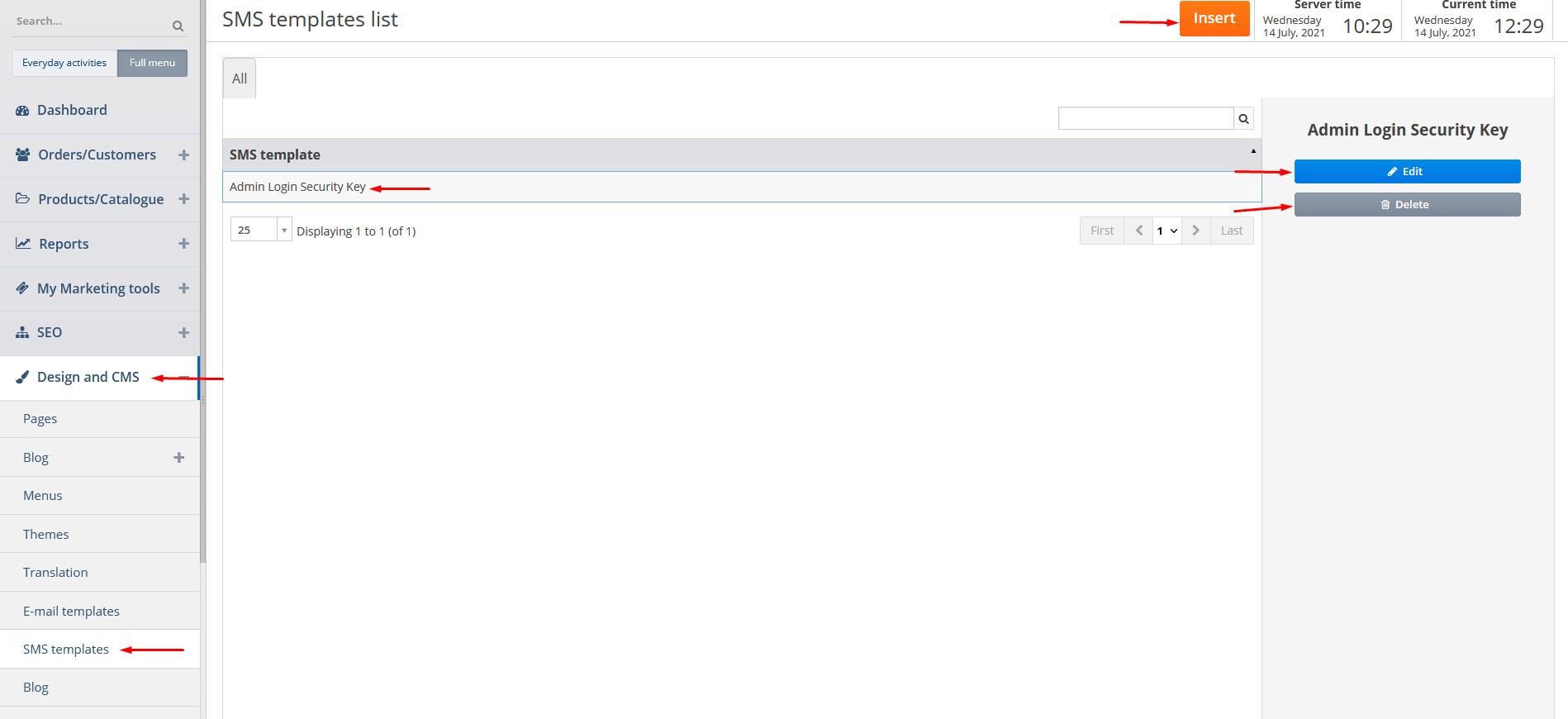 You can manage the SMS templates by clicking on Design and CMS and SMS templates tabs. You can add a new SMS template by clicking on Insert button or edit or delete the existing SMS template by clicking on it on the corresponding buttons.