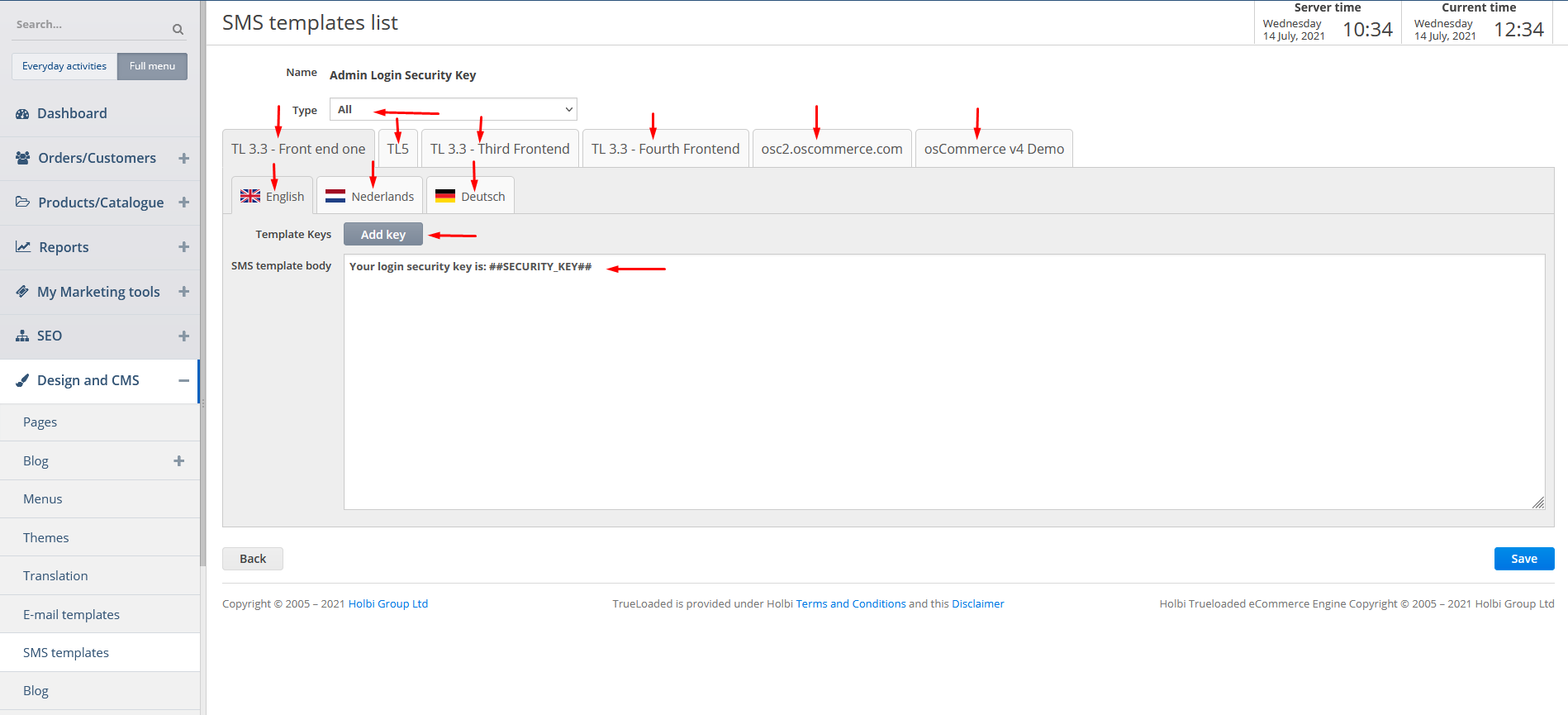 While adding/editing a SMS template you can specify its type from the drop down list, choose the required front end and the language by clicking on the corresponding tabs, add key by clicking on the corresponding button and add/update SMS template body.