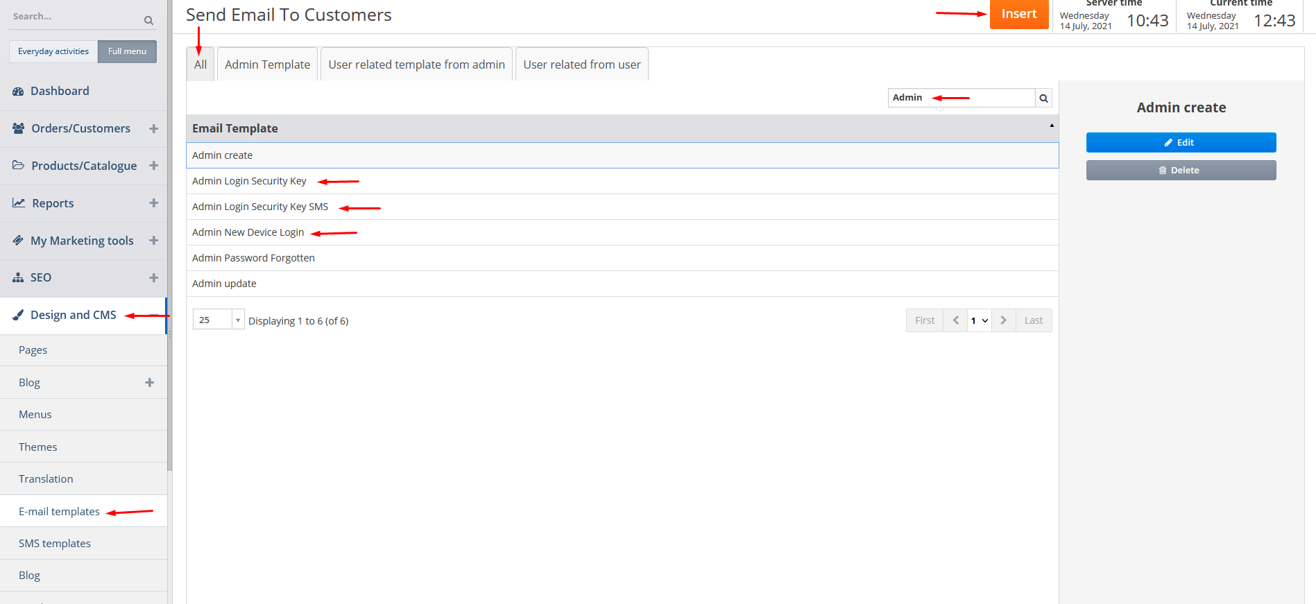 You can also manage the email templates by clicking on Design and CMS and E-mail templates tabs. You can add a new email template by clicking on Insert button or under All tab you can edit or delete the existing email template by clicking on it and then on the corresponding buttons (the highlighted email templates are connected with the functionality described in this manual).