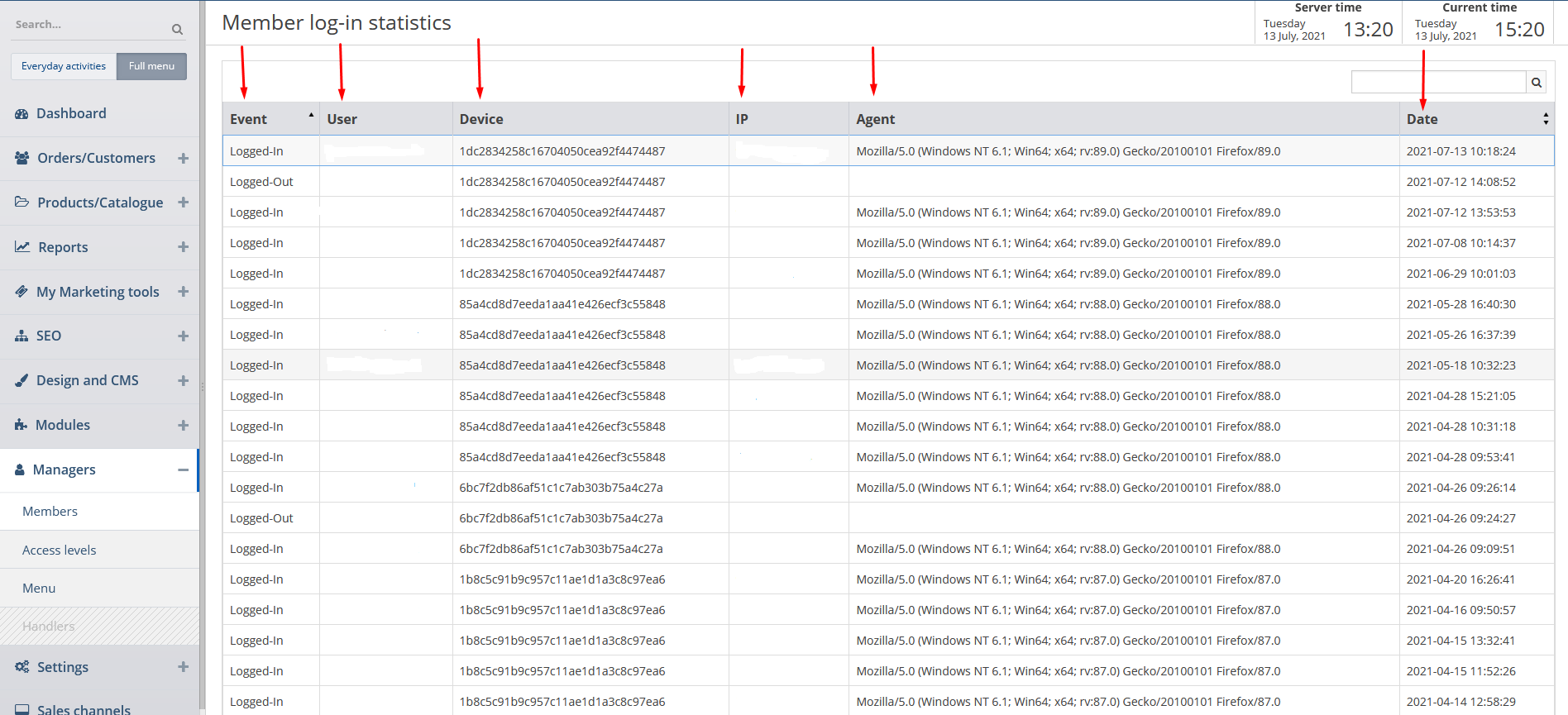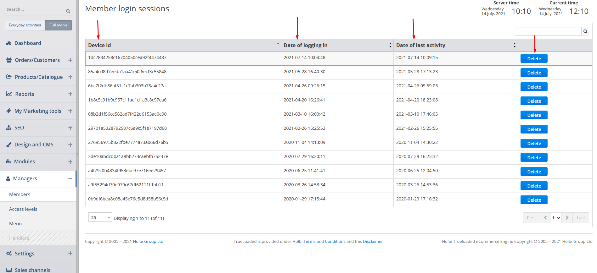 You can view the information in the columns as well as delete the required member login session by clicking on the corresponding button.