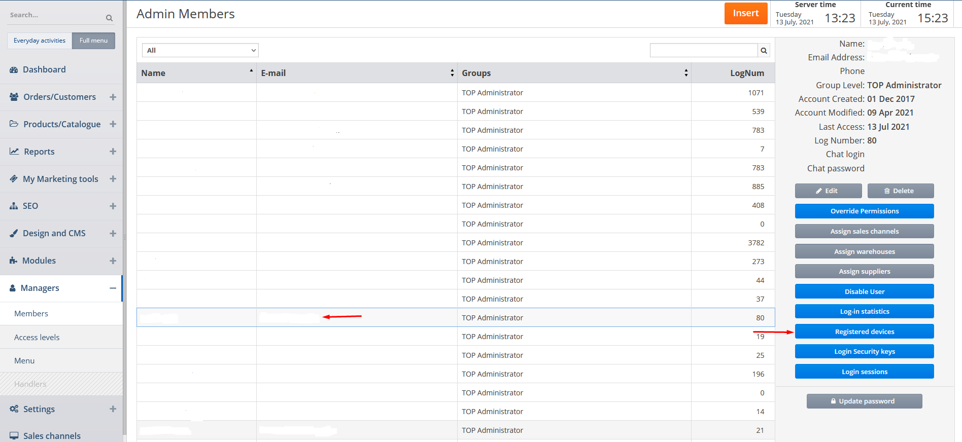 You can also view the registered devices for a certain member by clicking on him/her and then on the corresponding button.