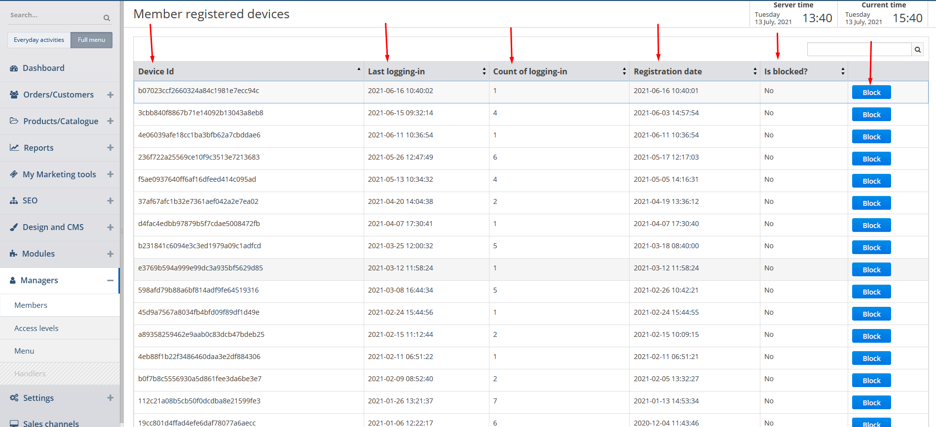 You can view the information in the columns as well as block the required device ID by clicking on the corresponding button.