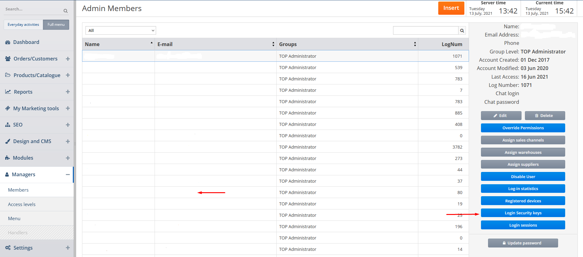 You can also view the log-in security keys for a certain member by clicking on him/her and then on the corresponding button.