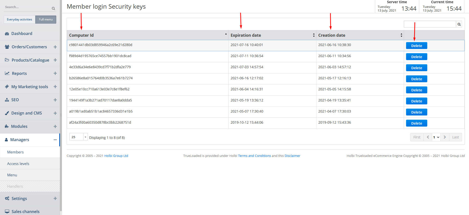 You can view the information in the columns as well as delete the required member login security keys by clicking on the corresponding button.